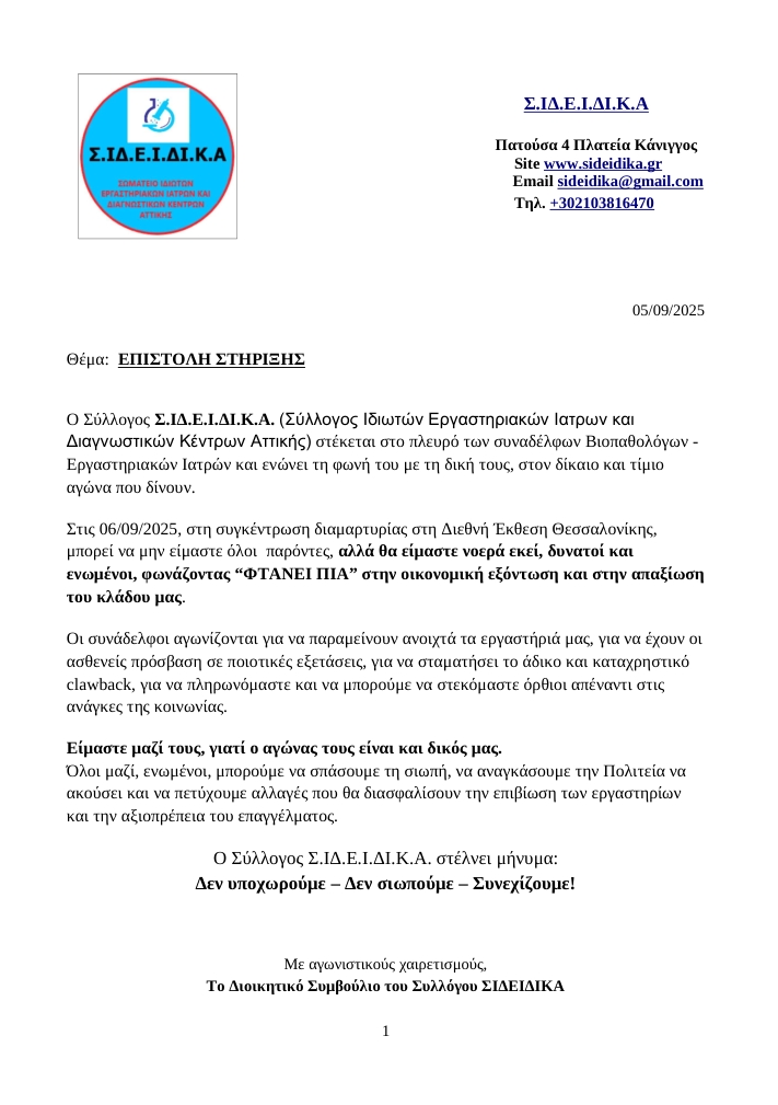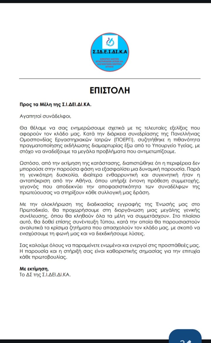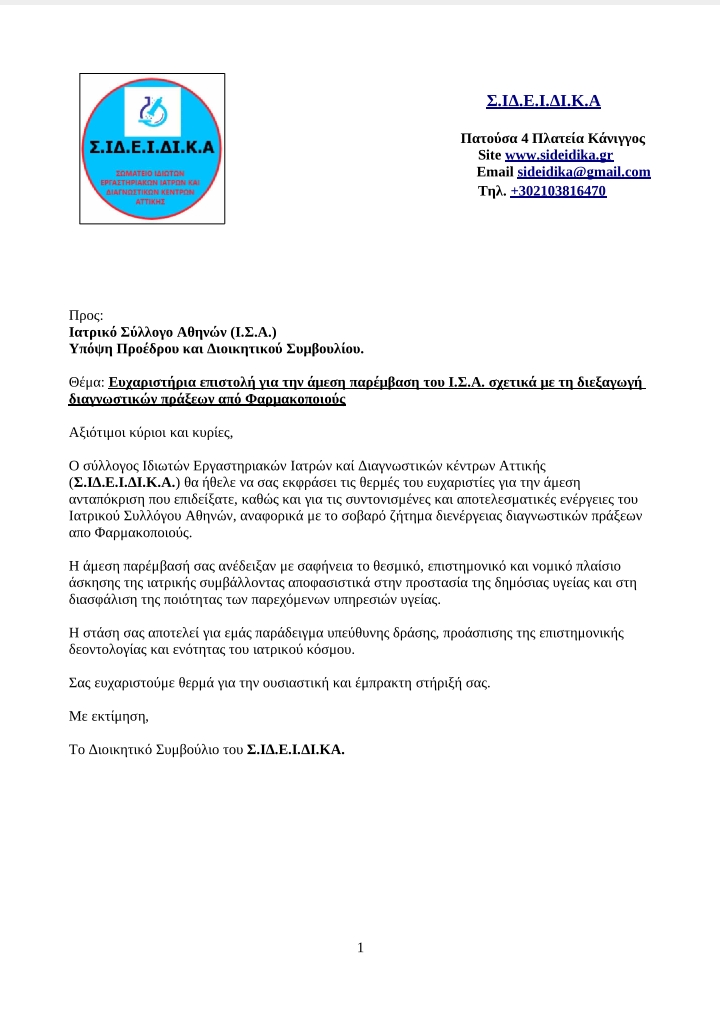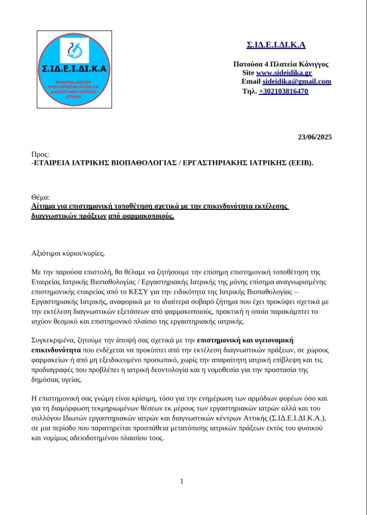 Η επιστημονική τοποθέτηση της ιατρικής εταιρείας ΕΕΙΒ/ΕΙ στο σύλλογο Σ.ΙΔ.Ε.Ι.ΔΙ.Κ.Α . για την διενέργεια γρήγορων τέστ.
